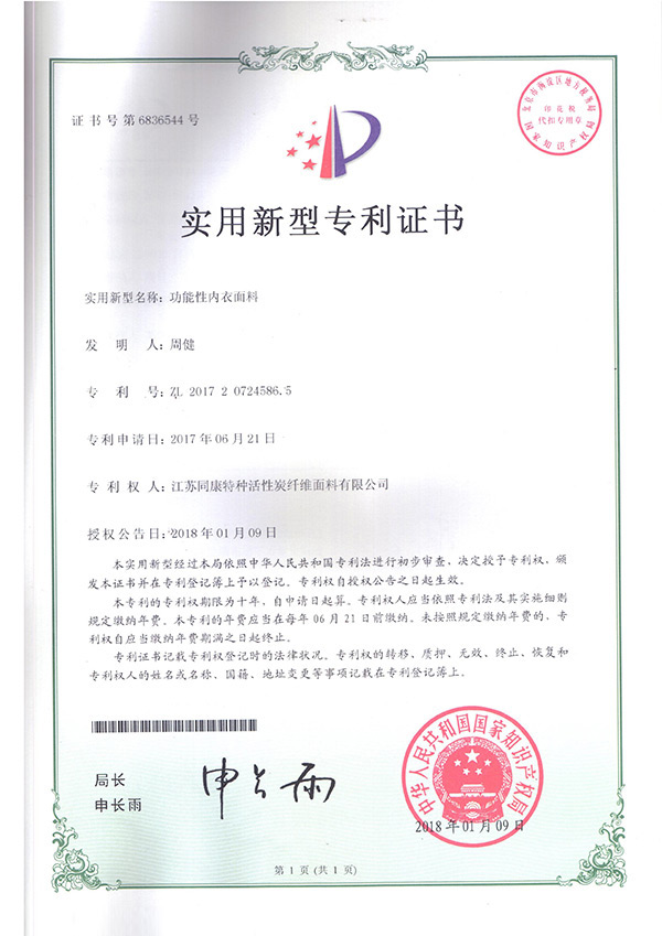 專利證書功能性內衣面料